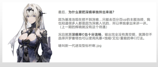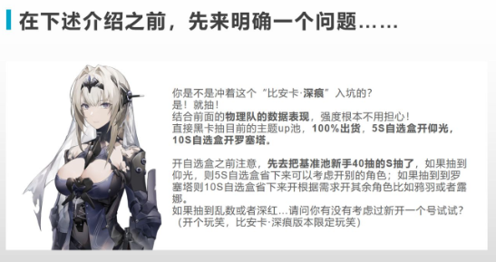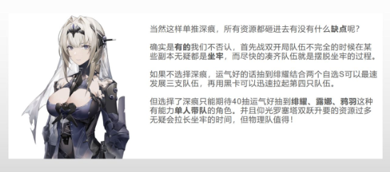本期内容因目前为深痕100%up期间,因此主要对物理队做推荐,如果黑卡资源较多可按照此路线走,如黑卡资源仅够抽取一个S角色,则建议将后续部分中“自选S开罗塞塔抽深痕”自动更换为“自选S开鸦羽/露娜组建对应队伍并抽深痕”。