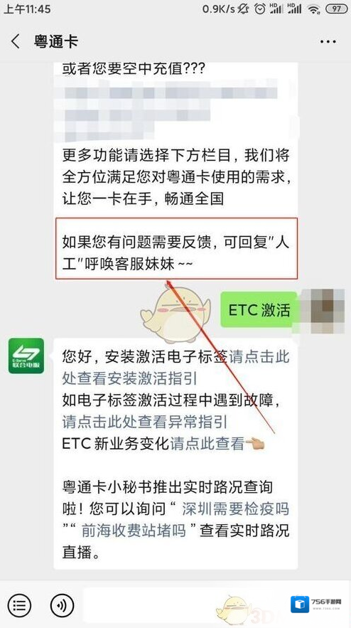 1、关注并进入粤通卡公众号,在公众号对话框中输入ETC激活