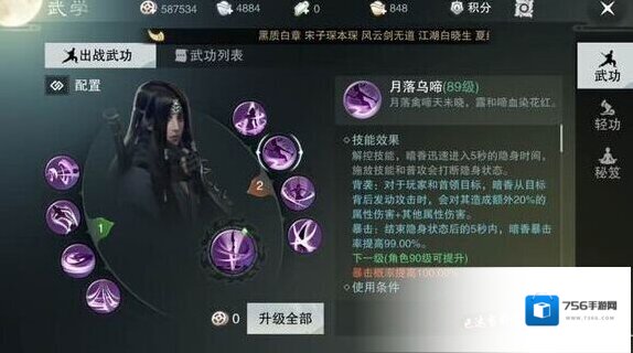 三:星飞云散。技能不多说各位自己看图,说一下用法,这个技能我喜欢拿来补伤害,三分明月打完接一下星飞云散,那感觉,简直美滋滋。还有种用法,后面介绍大隐身时一起介绍。