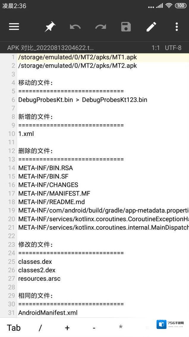 选中两个 APK/ZIP 文件长按即可进行 APK/ZIP 对比,对比结果以文本方式展示: