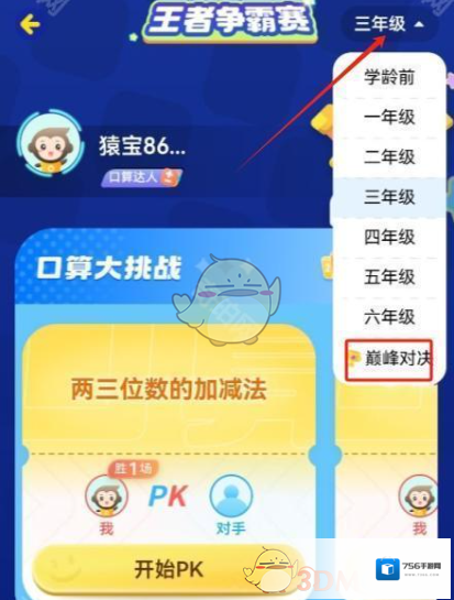 4、进入页面后点击右上角的“三年级”(自己的班级),下拉到底部可以看见“巅峰对决”。