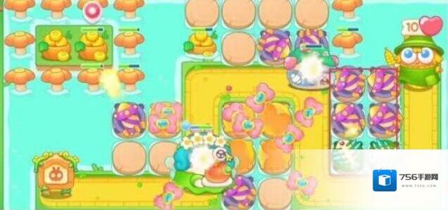 3.将箭头所示处放置一个蝴蝶结并升至满级,蝴蝶结的范围伤害可以快速清理掉下方的障碍物和附近的兔子
