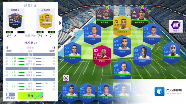 在编辑阵容界面内的一键布阵旁,新增了球员对比功能按钮,玩家可以拖动首发替补球员或者点击添加球员进行球员属性对比,根据自己的喜好选择心仪的比赛球员