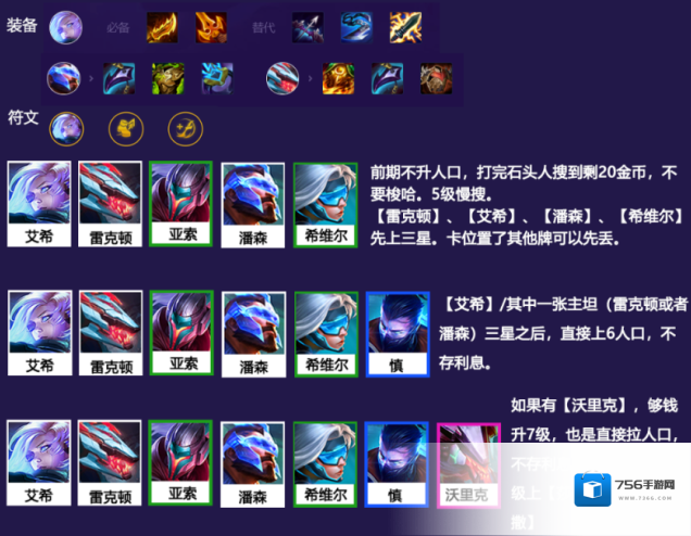 艾希和其中一张主坦(雷克顿或者潘森)三星之后,直接上6人口,不存利息。如果有沃里克,够钱升7级,也是直接拉人口,不存利息,8级也一样,8级上莎弥拉/莫德凯撒。