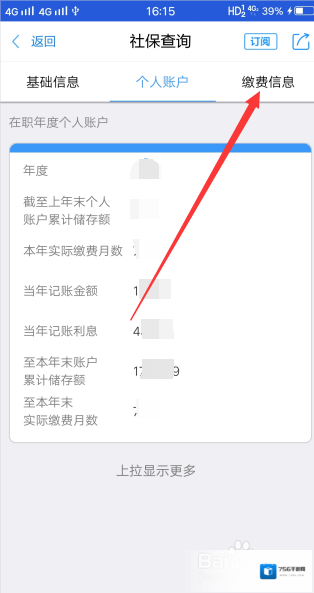 显示个人缴费年度个人账户内容。点击右侧的缴费信息标签。