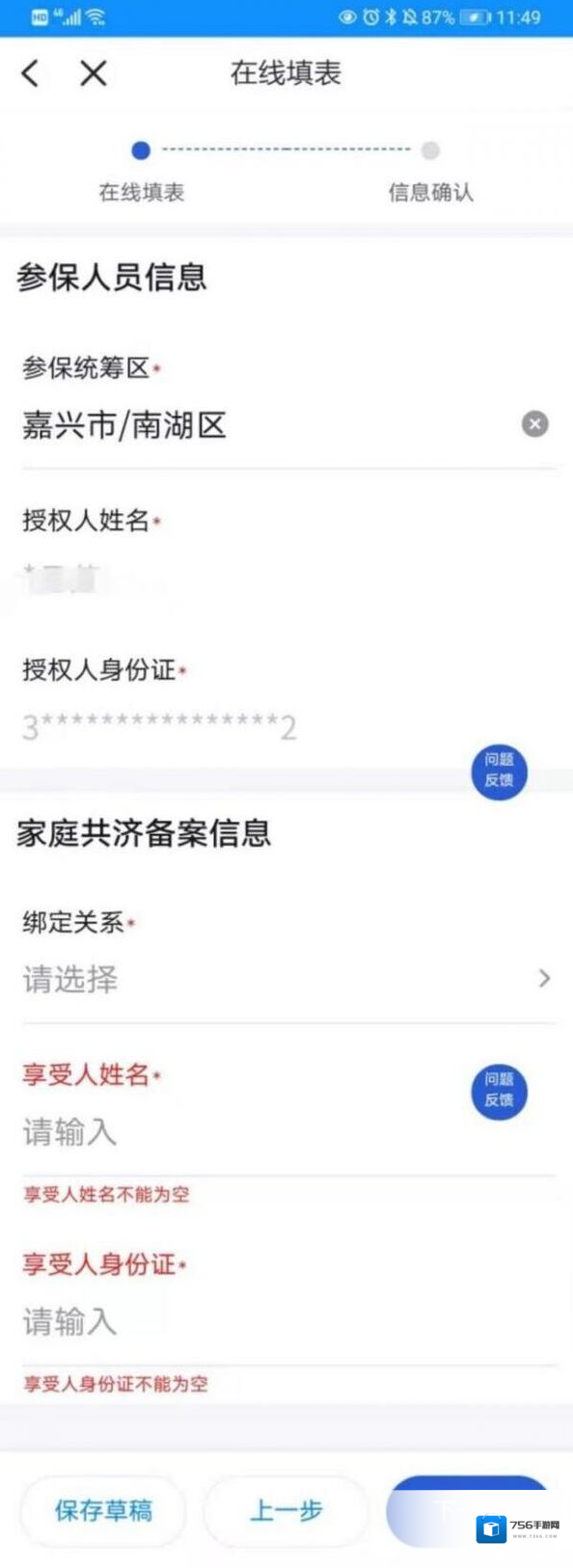 5、在线填表,完善“参保人员信息”和“家庭共济备案信息”,点击下一步即可