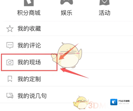 2、打开“现场”栏目。点击右下角的图标。