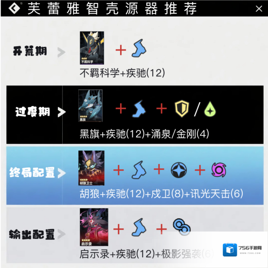 为大家制作了一图流智壳源器推荐,12疾驰是必须的,后期有2种玩法一种是辅助高速增益队友,一种是启示录多段输出高速打速攻。这个版本由于启示录在pvp中被削弱所以推荐玩高速胡狼辅助流就好。