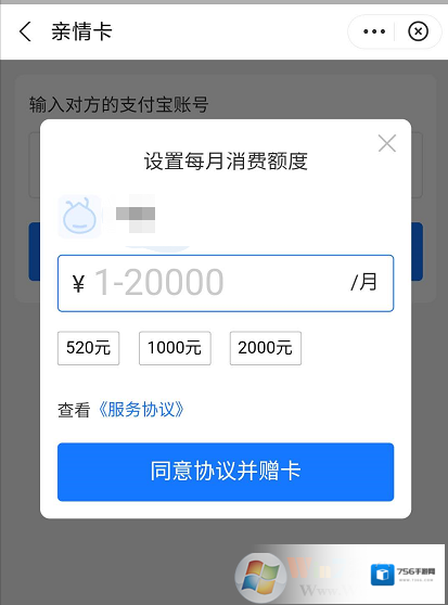 5、输入每个月可用的额度,点击同意协议并赠卡,开通完成;