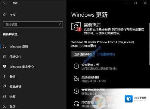 现在到“Windows设置 – 更新和安全 – Windows更新”设置界面。