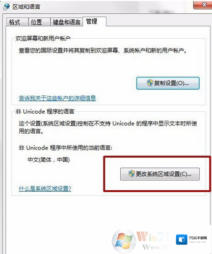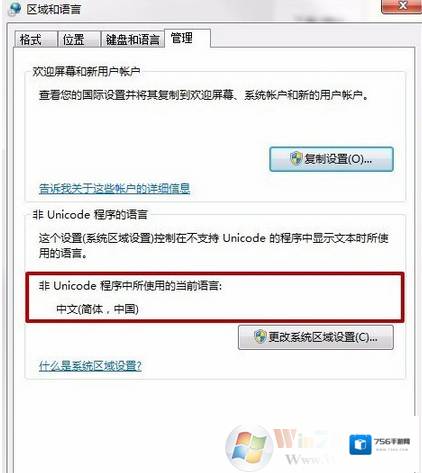 6、切换到“管理”面板,查看非unicode程序语言是否为中文。