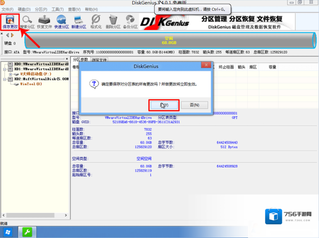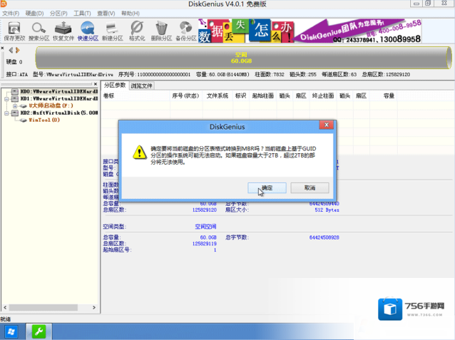 7、在弹出的提示窗口中选择“确定”。注:一般GUI分区表格式支持超过2TB以上的硬盘分区,而MBR分区表类型只支持2TB以下的硬盘。