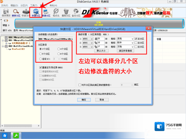 8、转换MBR成功后,选择快速分区,根据要求创建自己的分区。选择完成后,点击确定开始分区,如下图所示: