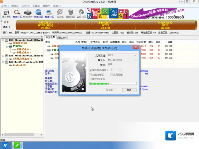 9、分区开始后,会出现格式化盘符的提示窗口,等待完成。退出DiskGenius软件。winwin7.com