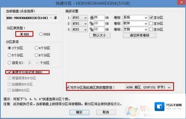 重新分区:磁盘格式转换完成后,点击快速分区,勾选 分区表类型为 MbR ,勾选了重建主引导记录MBR,选择需要分区的个数以及大小,当然大家可以点击“自定”来设置合适的分区,按下确定后开始分区(如果是固态硬盘或者是东芝的硬盘要进行4K对齐一下),如下图: