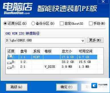 3、分区完成后运行桌面的”一键装机还原”工具,然后选择win7系统镜像文件,以c盘为系统盘,把win7系统安装在c盘中,点击确定;