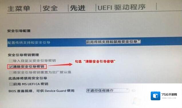 4、F10保存重启后,再连续按ESC,然后选择F10进入BIOS设置,进入刚设置的地方,勾选清除安全引导密钥,然后按F10保存;