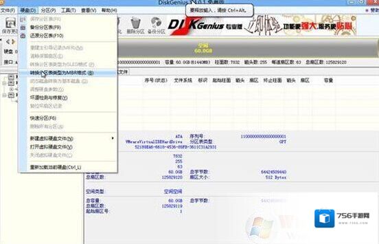 1、选择U盘启动盘进入PE后,在桌面上运行DiskGenius分区工具,点击菜单栏的硬盘,选择转换分区表类型为MBR格式,然后点击快速分区进行分区;