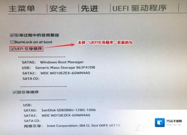 6、进入后取消勾选UEFI引导顺序,让机器默认为传统启动,这样方便安装WIN7;