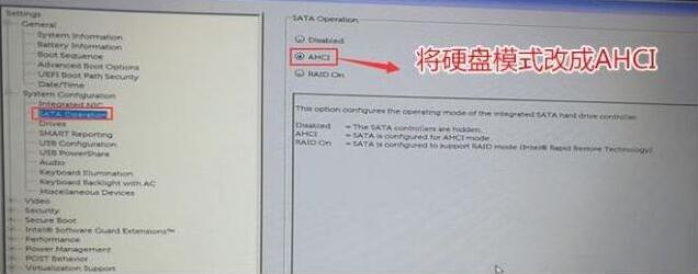5、注意:切换到system configuration项,如果硬盘模式是ahci,将sata operatior硬盘模式改为ahci模式,否则安装win7会同现0x0000007b蓝屏,改了后选择退出并保存BIOS,如下图所示;