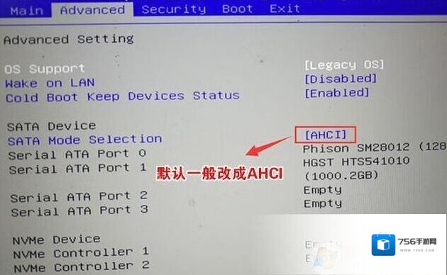 4、再将移动上下方向键,移动到Advanced中将SATA Mode Selection选项的启动项更改为AHCI,否则安装WIN7会出现0x00007b蓝屏,如下图所示,然后再F4保存设置,如图: