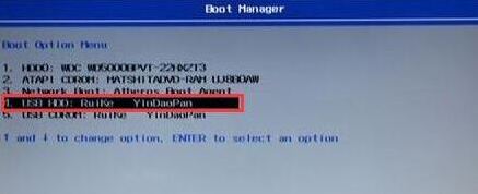 5、插入U盘启动盘,重启时不停的按下f12,打开Boot Manager,选择USB HDD回车从U盘启动,如截图所示: