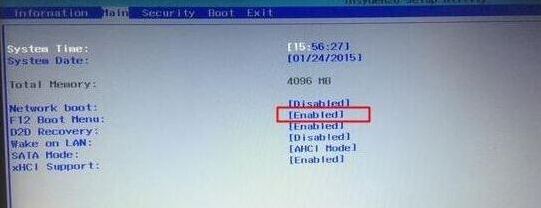 4、转到Main,选择F12 Boot Menu回车,设置为Enabled,按F10选择Yes回车保存修改,如截图: