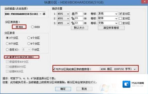 重新分区:磁盘格式转换完成后,点击快速分区,勾选 分区表类型为 MbR ,勾选了重建主引导记录MBR,选择需要分区的个数以及大小,当然大家可以点击“自定”来设置合适的分区,按下确定后开始分区(如果是固态硬盘或者是东芝的硬盘要进行4K对齐一下),如下图: