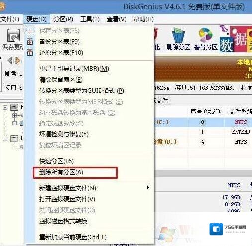 2、打开桌面上的Diskgenius分区工具(DG分区工具);打开Diskgenius后,选择笔记本硬盘,然后点击“硬盘”,查看菜单中的“转换分区表类型为MBR格式”选项是否灰色,如果是灰色的话那么我们就无需进行重新分区,除了C盘系统盘和桌面上的资料,重装系统后其他磁盘中的资料都不会被清空,如果“转换分区表类型为MBR格式”选项是可选的,则需要将整个硬盘格式化,操作方法如下:删除分区:点击“硬盘”–“删除所有分区”,删除前确保资料已经转移,删除后,点击保存更改,如图:
