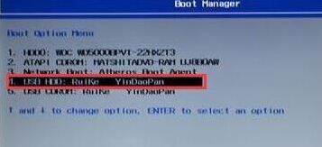 5、插入U盘启动盘,重启时不停的按下f12,打开Boot Manager,选择USB HDD回车从U盘启动,如下图所示;