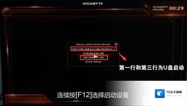 6、插入U盘启动盘,重启不停的按F12,选择识别到U盘启动项(默认有uefi U盘启动和传统模式,这里记得要uefi启动的就要制作支持uefi的U盘启动),回车,如下图所示;二、技嘉Z390主板U盘启动1、插入我们制作好的U盘启动盘,然后重启不停的按F12,这时会出现启动项选择菜单,我们会出现有UEFI的U盘和没有U盘,装Win7我们选择不带UEFI的启动;