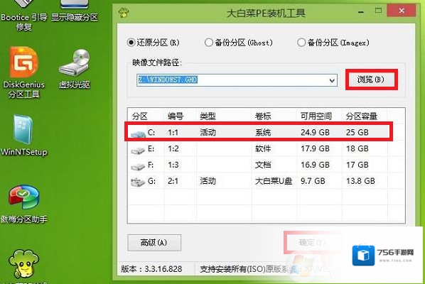 三、技嘉Z390 Win7系统安装1、运行PE桌面上的一键装机工具,然后选择Win7.GHO镜像,并且选择C盘,然后确定安装即可。