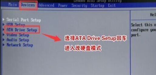 4、切将键盘移动Devices选项,把键盘移动ATA Drive Setup回车,将configure SATA as中默认的raid改成ahci模式,否则安装win7时会出现0x0000007b蓝屏,因为win7中没有集成raid硬盘驱动,然后选择F10保存设置,在弹出的选项中选择YES,如下图所示;