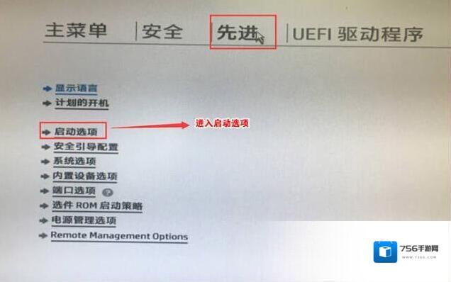 5、F10保存重启后再次开机按ESC,然后选择F10进入BIOS设置,将鼠标移动“先进”选项中,选择”启动选项”后回车进入,如下图所示;