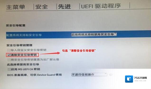 4、F10保存重启后再次开机按ESC,然后选择F10进入BIOS设置,将进入刚设置的地方,勾选“清除安全引导密钥”,然后再次F10保存;