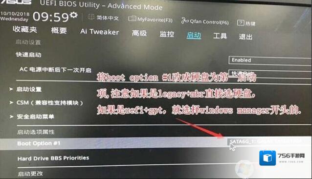 4、继续把boot option#1选项改为普通引导的,设置第一启动项为普通硬盘引导,如果采用的是uefi+gpt的就要选带Windwos Boot Manager的为UEFI引导分区,然后按F10保存设置;