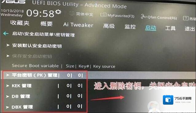 2、进入高级模式后,按→方向键移动到”启动”选项,选择安全启动菜单,然后回车进入密钥管理清除密钥关闭安全启动;