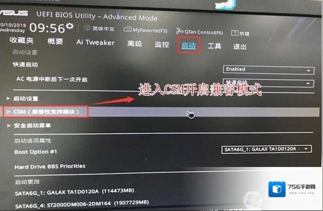4、再返回到”启动”的选项,把CSM由disabled改成enabled,开启兼容模式,如下图所示;