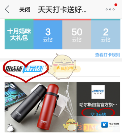 3.点击页面“打卡领云钻”,即可随机领取,另外,现在连续打卡7天会再奖励18个云钻;