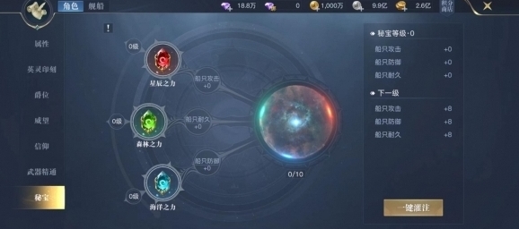 神秘的海洋中,隐藏着众多不为人知的秘宝,等待冒险者发掘它们的价值。秘宝系统是附属于探险系统中的属性提升方式。冒险者可以通过上报清单、船长见闻录、寻找地图中的宝物等方式来获取秘宝。不同的秘宝可以提供不同的属性,累积灌注一定数量的秘宝还能提升等级,带来更多属性加成。