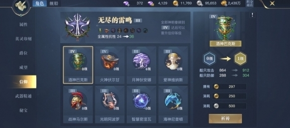 虔诚的信仰,是冒险者劈波斩浪,平安归来的一大隐形利器。冒险者可以通过收集商会贡献和银币来对神明进行祈祷,以获取他们的眷顾,得到大量属性加成。当全部神明都祈祷到一定次数后,会额外晋升信仰等阶,带来更多属性加成。