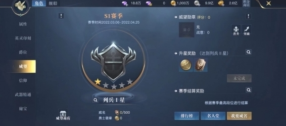 威望系统采用赛季制度。在单一赛季之内,冒险者通过积攒到指定数量的威名后,可以提升当前赛季内的星级,到达一定星级晋升至下一军衔,并大幅提升威望勋章的属性。并且,在冒险者通过商会相关的PVP活动获得威望勋章后,也可以兑换星魂来提升威望勋章的属性。获得更优秀的威望勋章,还能令冒险者在PVP相关的战斗中获得专属的属性提升。
