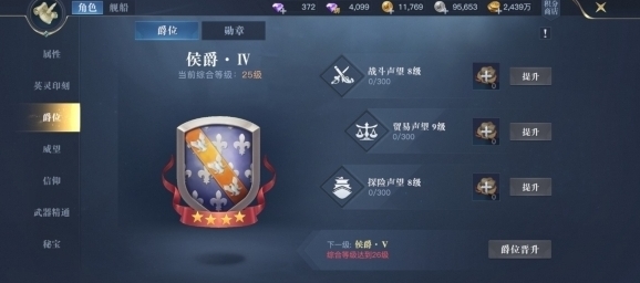 爵位是对冒险者生涯的一种见证方式。冒险者可以通过征服者试炼、购买投资礼包、提升探险等级三种途径来获得战斗、贸易和探险声望函,三种声望函分别对应三种声望进度条,任意进度条每提升一级,就可以将当前的爵位进阶一次。