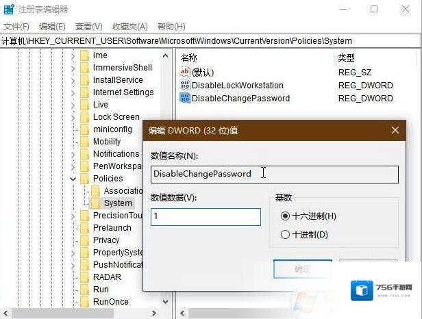 5、同样,如果要禁止更改密码,新建一个名为DisableChangePassword的DWORD (32 位)值,接着将其数值数据更改为1(图8)。