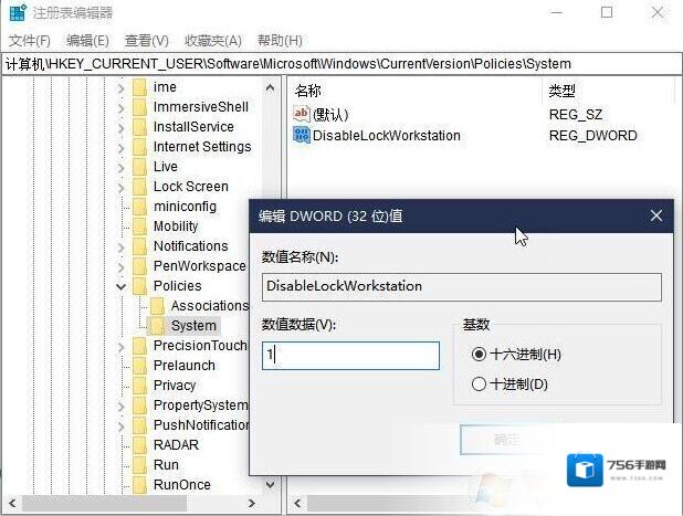 如果要禁止锁定屏幕,在右键新建一个名为DisableLockWorkstation的DWORD (32 位)值,然后双击该项,将其数值数据设定为1,点击“确定”按钮(图7)。