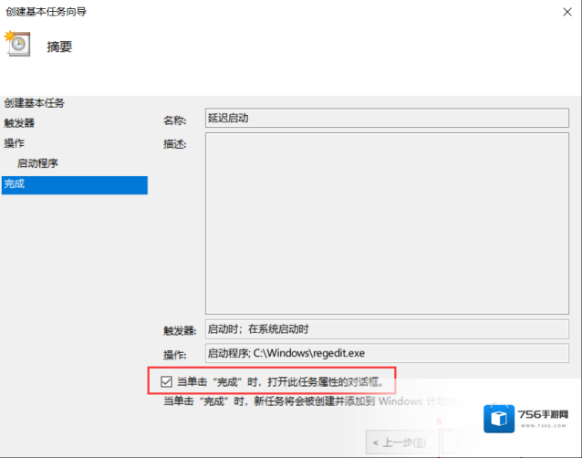 5、到这一步初步开机启动计划任务完成!大家可以勾选,单完成时打开此任务属性的对话框;