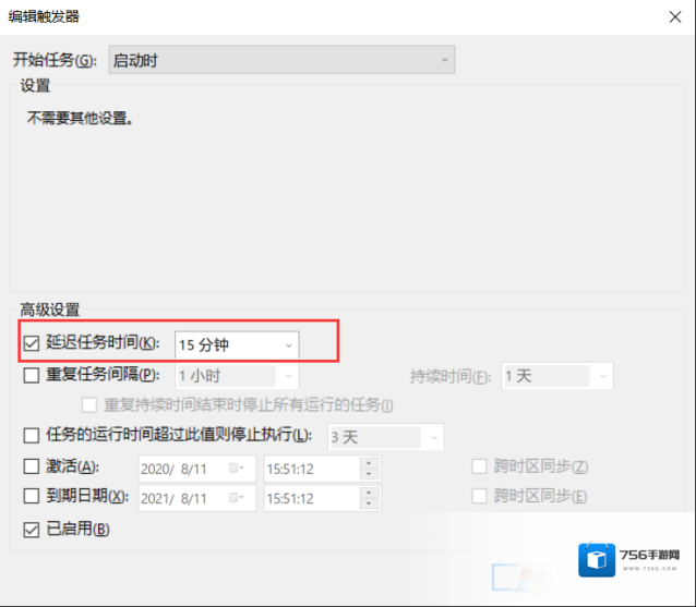 7、勾选延迟任务时间,如15分钟,也就是计算机启动后的15分钟运行你设置的程序。