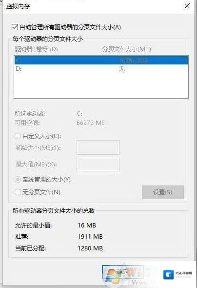 6、取消勾选“自动管理所有驱动器分页文件大小。