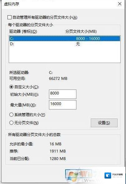7、虚拟内存最佳设置就是(虚拟内存是物理内存的2倍),例如我们电脑采用的是8GB内存,点选“自定义大小”,我们将虚拟内存的初始大小设置为8000M(物理内存大小),最大值为16000M(物理内存的2倍),并且点击设置按钮,再确定。