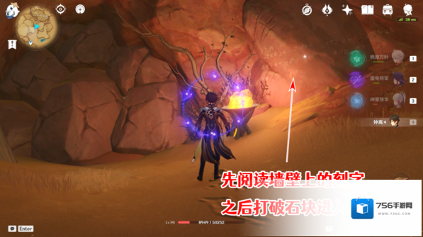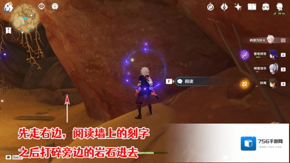 我们先走右手边这条被岩石挡住的路。进去之前先把入口处墙壁上的刻字阅读一下,之后打碎岩石进入右边通道。